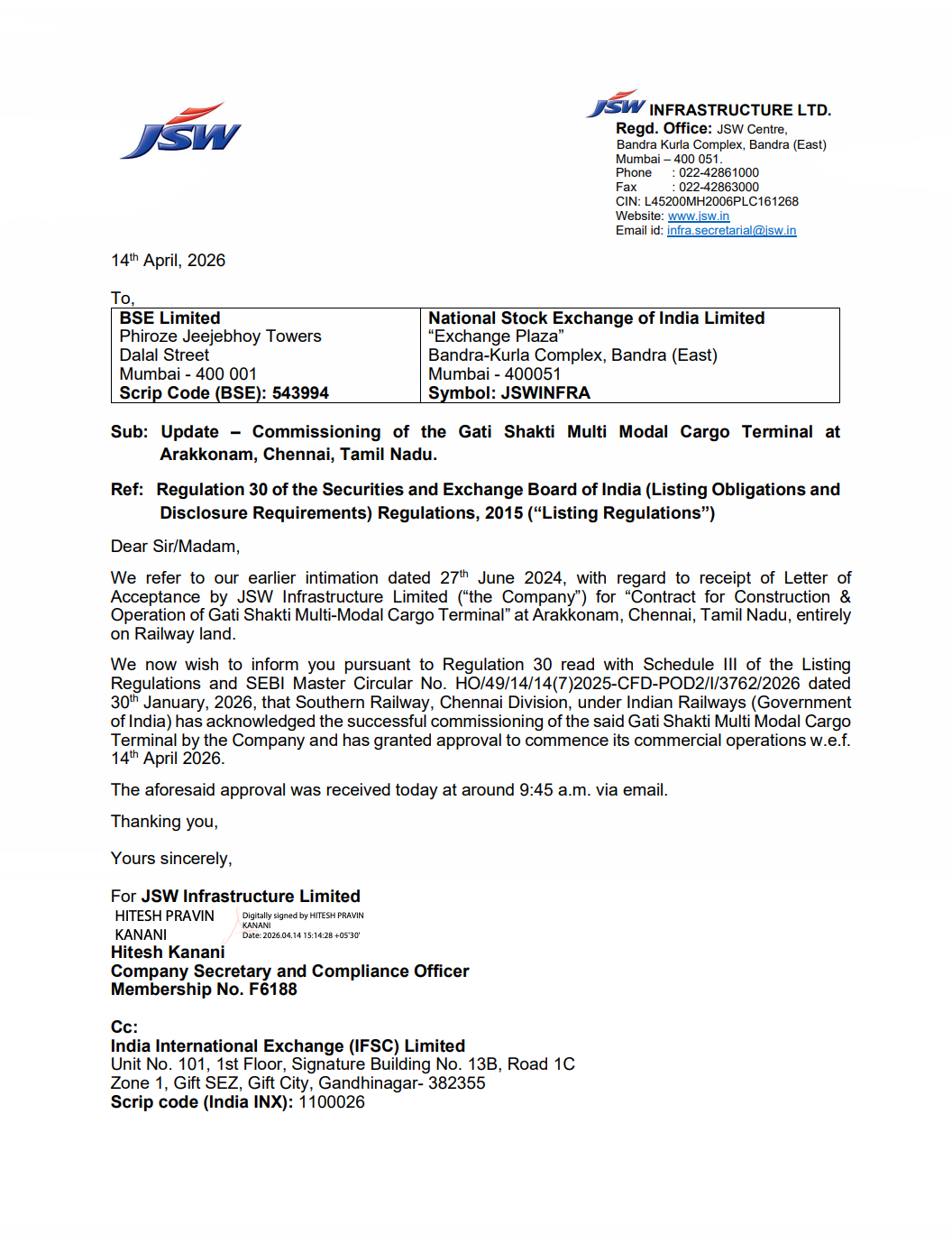 JSW Infrastructure Limited has successfully commissioned its Gati Shakti Multi-Modal Cargo Terminal at Arakkonam (near Chennai), Tamil Nadu, and received approval to commence commercial operations from April 14, 2026.