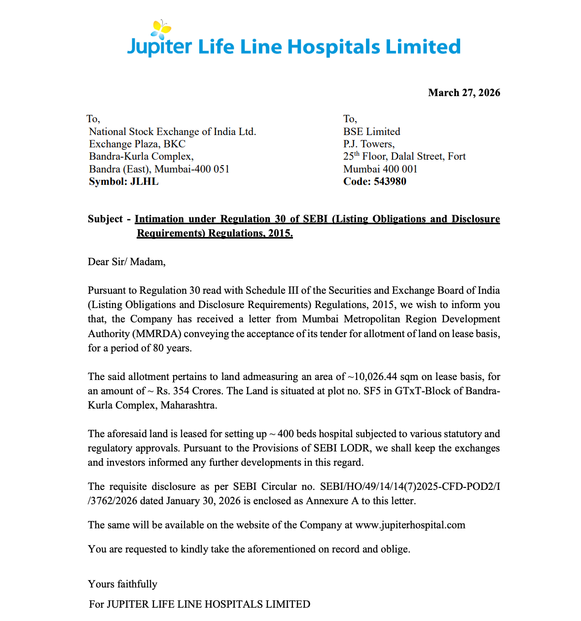 Jupiter Life Line Hospitals has received approval from MMRDA for allotment of land in Bandra-Kurla Complex (BKC) on a long-term lease (80 years).