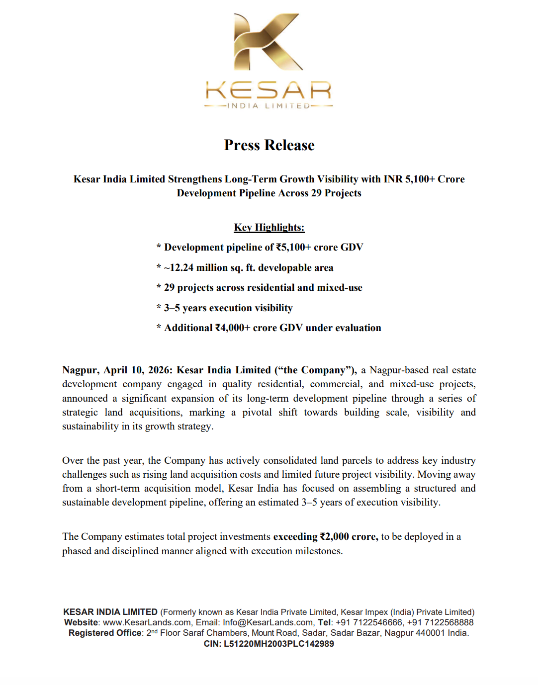 Kesar India Limited announced a significant expansion of its development pipeline through strategic land acquisitions.
