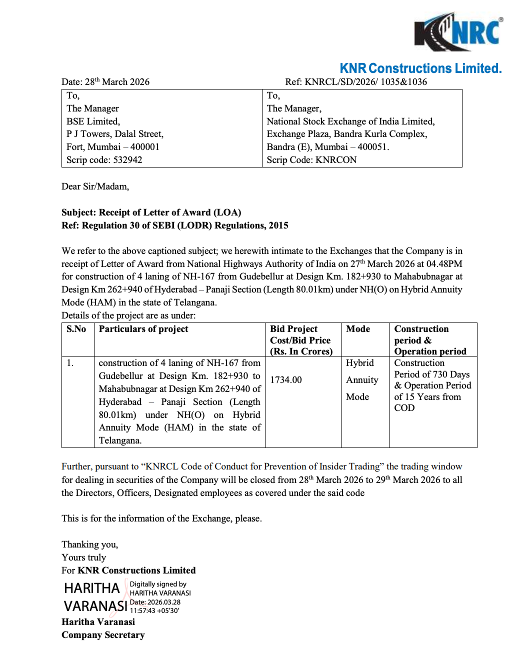 KNR Constructions has received a Letter of Award (LOA) from NHAI for a ₹1,734 Cr highway project in Telangana under the Hybrid Annuity Model (HAM).
