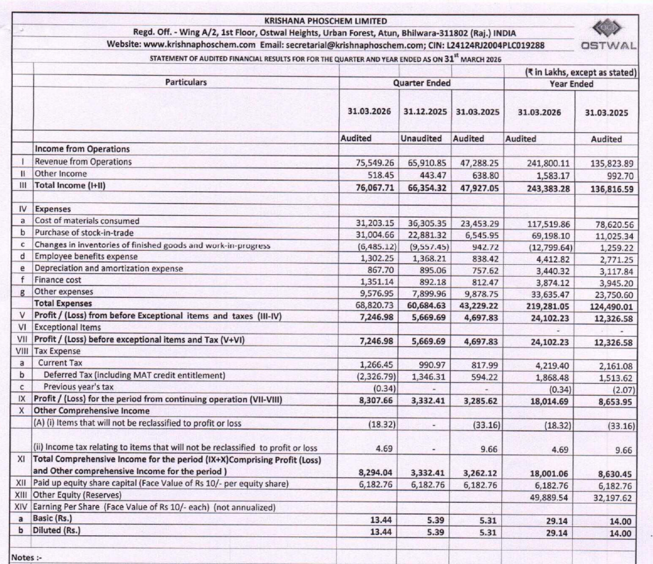 Krishana Phoschem reported a strong Q4 FY26 performance, supported by sharp revenue growth, strong profit expansion, higher inventory-led operating scale, and significant balance sheet growth.