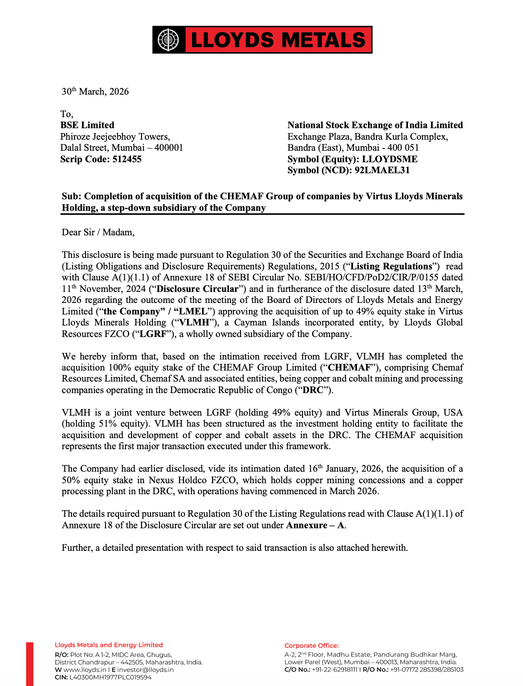 Lloyds Metals and Energy Limited has completed the acquisition of the CHEMAF Group, through its step-down subsidiary. This move marks a strategic expansion into copper and cobalt mining assets in Africa (DRC), strengthening its global resource portfolio.