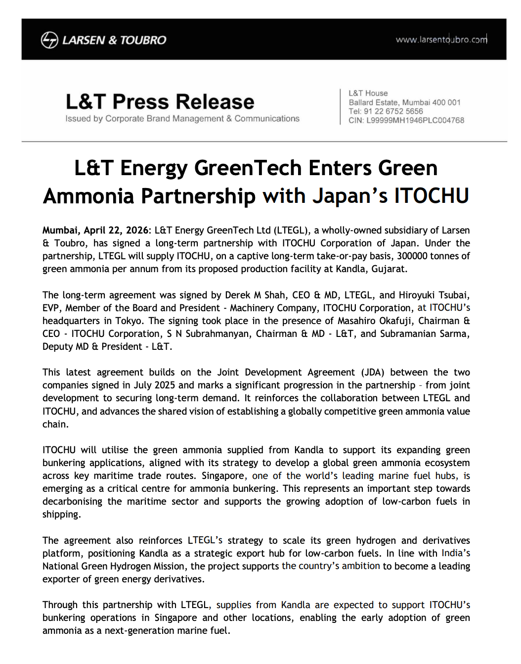 L&T Energy GreenTech Ltd (LTEGL) has signed a long-term agreement with ITOCHU Corporation under which it will supply 300,000 tonnes per annum of green ammonia on a take-or-pay basis from its upcoming production facility in Kandla, Gujarat