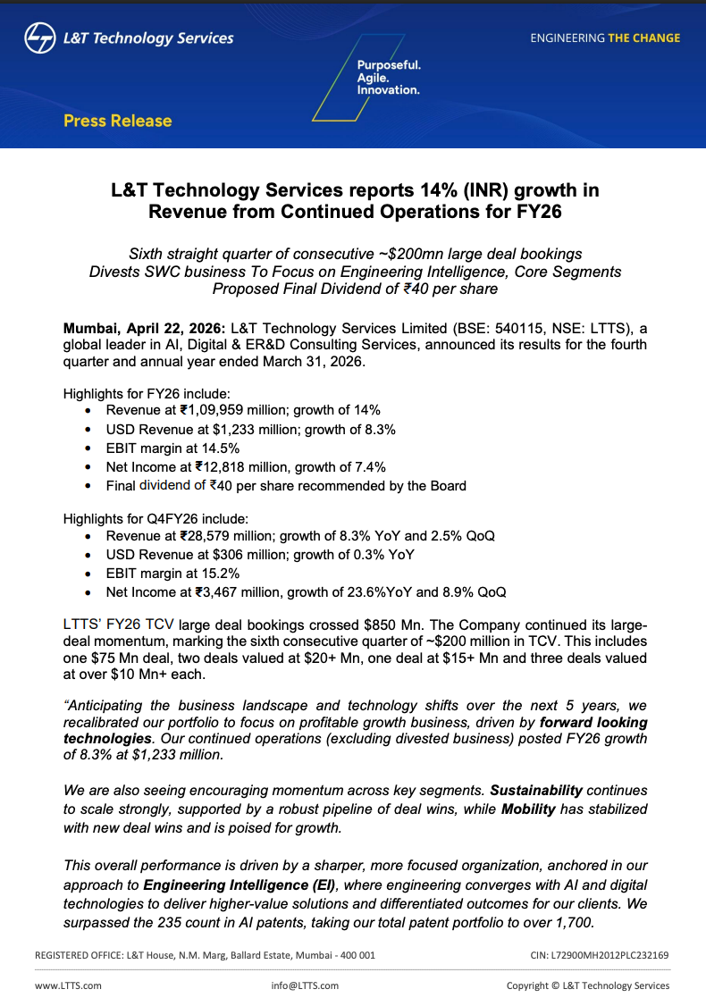 L&T Technology Services announced its FY26 and Q4FY26 results, reporting strong revenue growth supported by continued large deal wins and improving segment momentum, along with a proposed dividend payout.