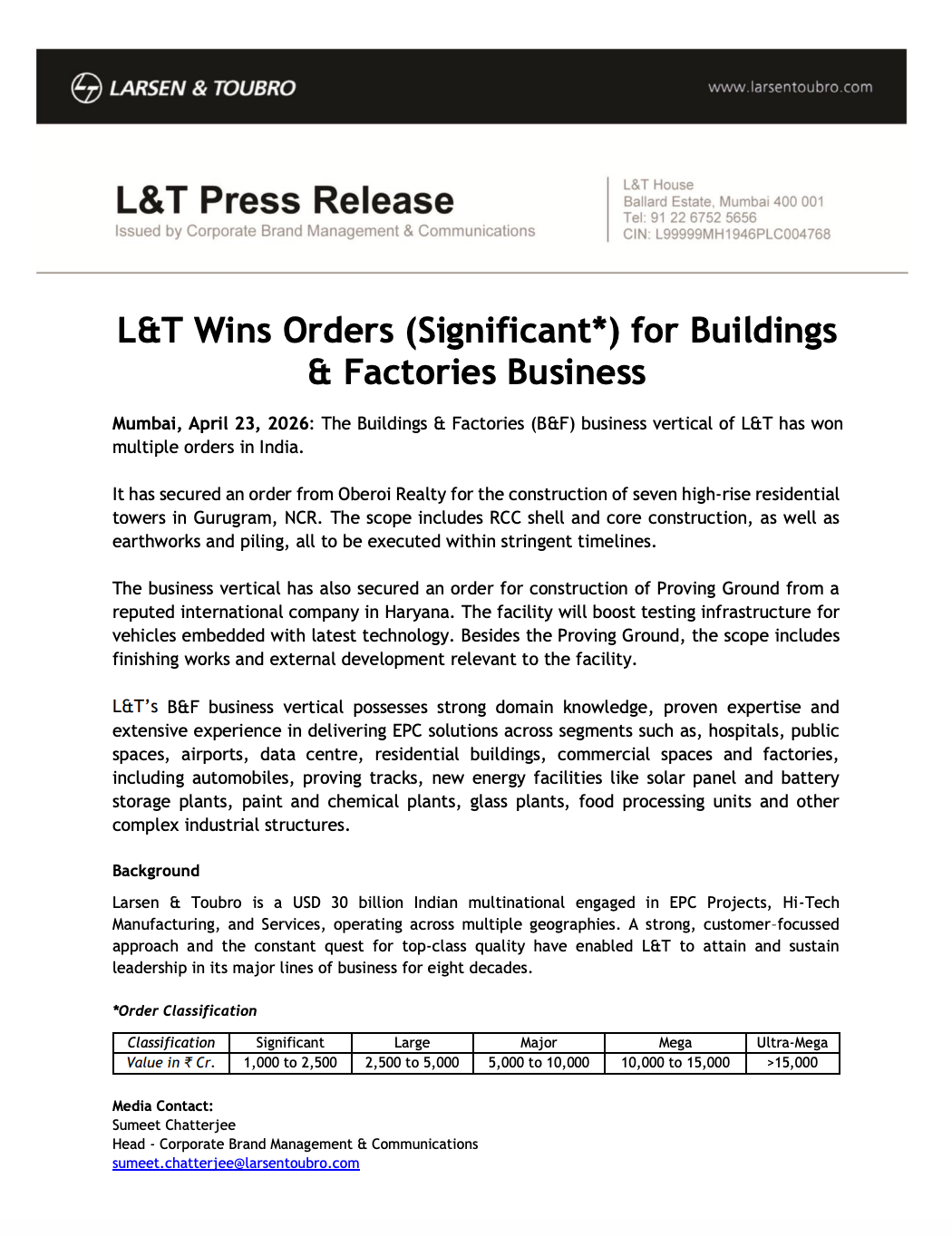 L&T’s Buildings & Factories business has secured multiple orders in India, including a contract from Oberoi Realty for construction of seven high-rise residential towers in Gurugram and another order for developing a vehicle proving ground facility in Haryana.