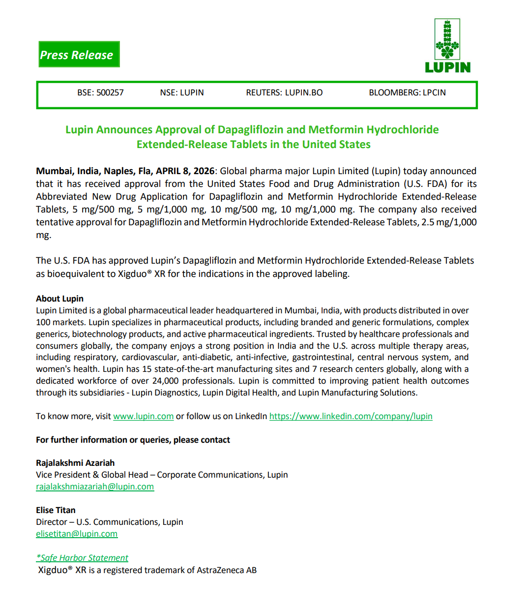 Official Exchange Filing: Lupin Limited