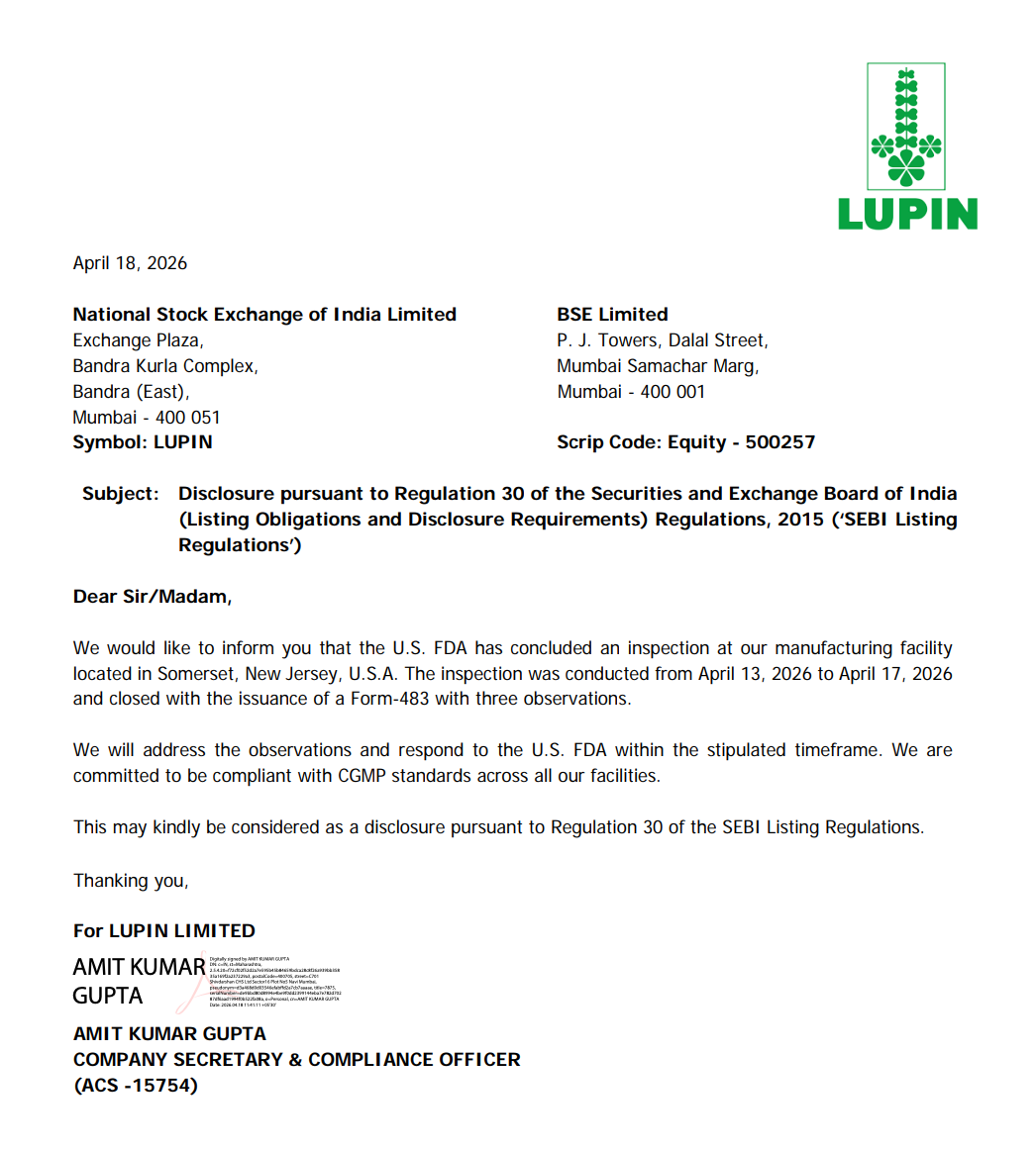 Lupin disclosed that the U.S. FDA concluded an inspection at its Somerset manufacturing facility with issuance of Form 483 containing three observations.