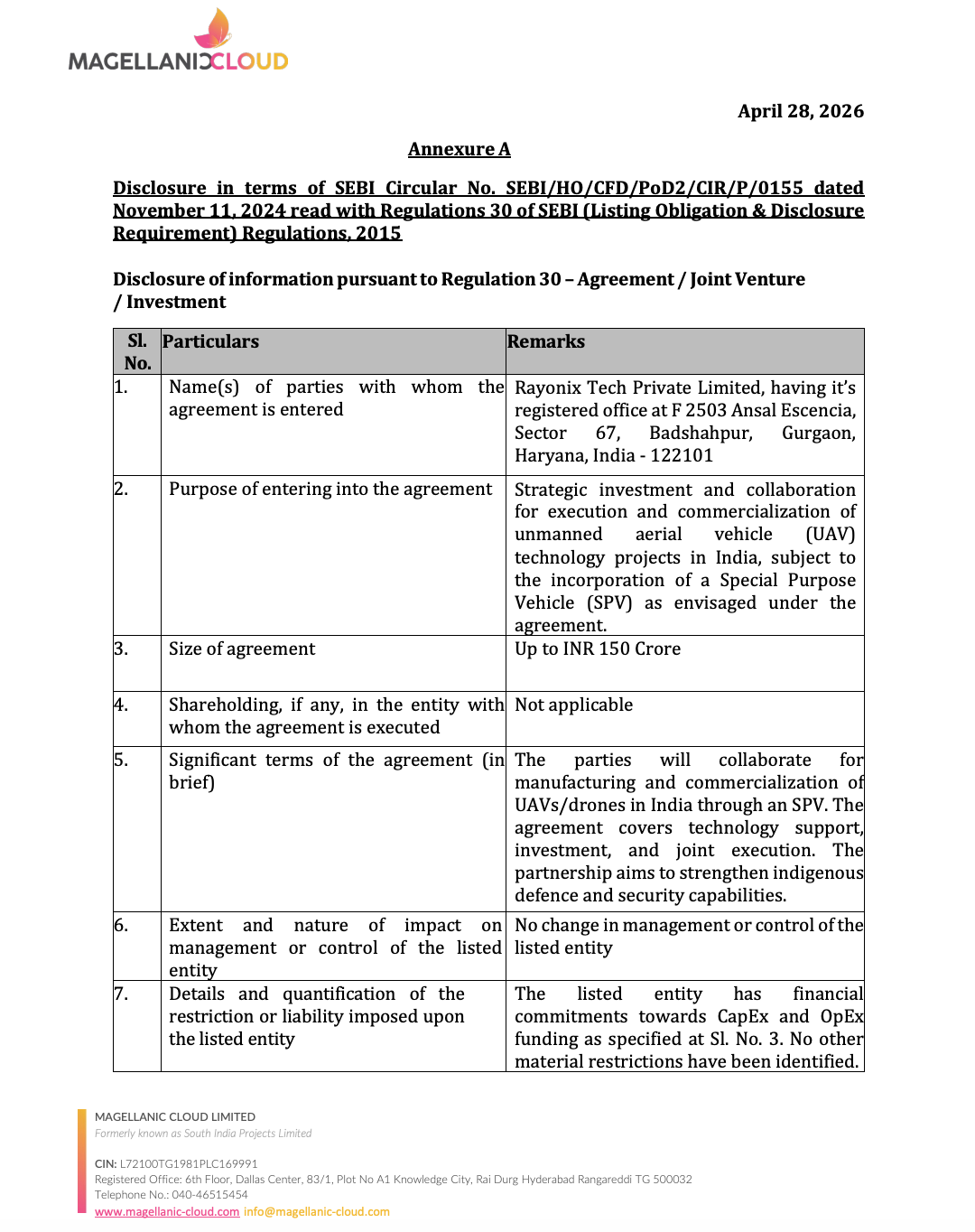 Magellanic Cloud Limited has entered into a strategic investment and collaboration agreement with Rayonix Tech Pvt. Ltd. to develop and commercialize UAV (drone) technologies in India, with a deal size of up to ₹150 crore