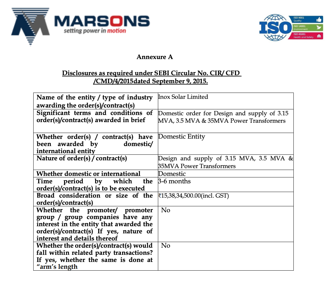 Marsons Limited has received a purchase order worth ₹15.38 crore from Inox Solar Limited for the design and supply of power transformers, strengthening its order book and revenue visibility