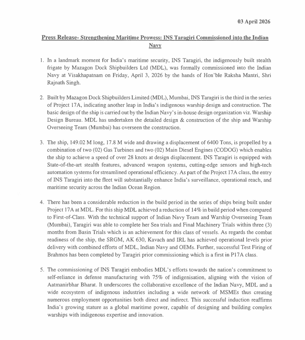 Mazagon Dock Shipbuilders Limited (MDL) announced the commissioning of INS Taragiri, an indigenously built stealth frigate, into the Indian Navy at Visakhapatnam.
