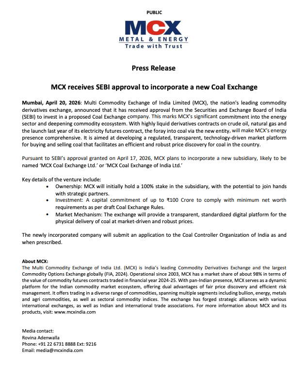 MCX announced that it has received approval from SEBI to incorporate a new subsidiary to establish a Coal Exchange.