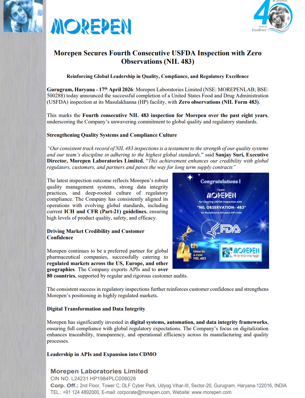 Morepen Laboratories has successfully cleared a USFDA inspection at its Masulkhana (HP) facility with zero observations (NIL Form 483), marking its fourth consecutive clean inspection and reinforcing its global regulatory credibility.