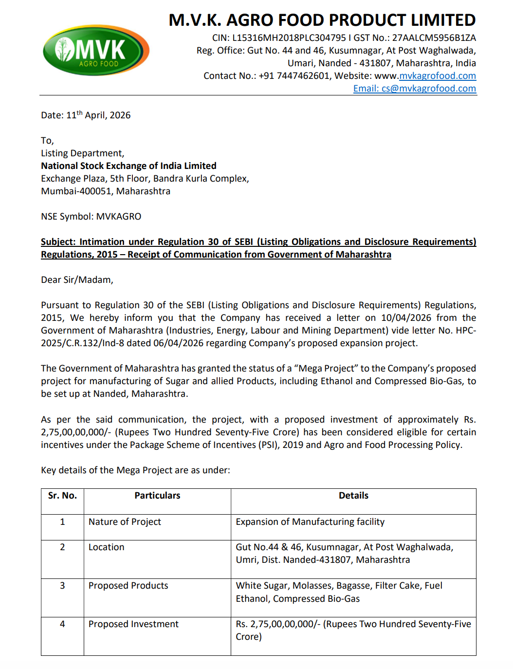 Official Exchange Filing: M.V.K. Agro Food Product Limited