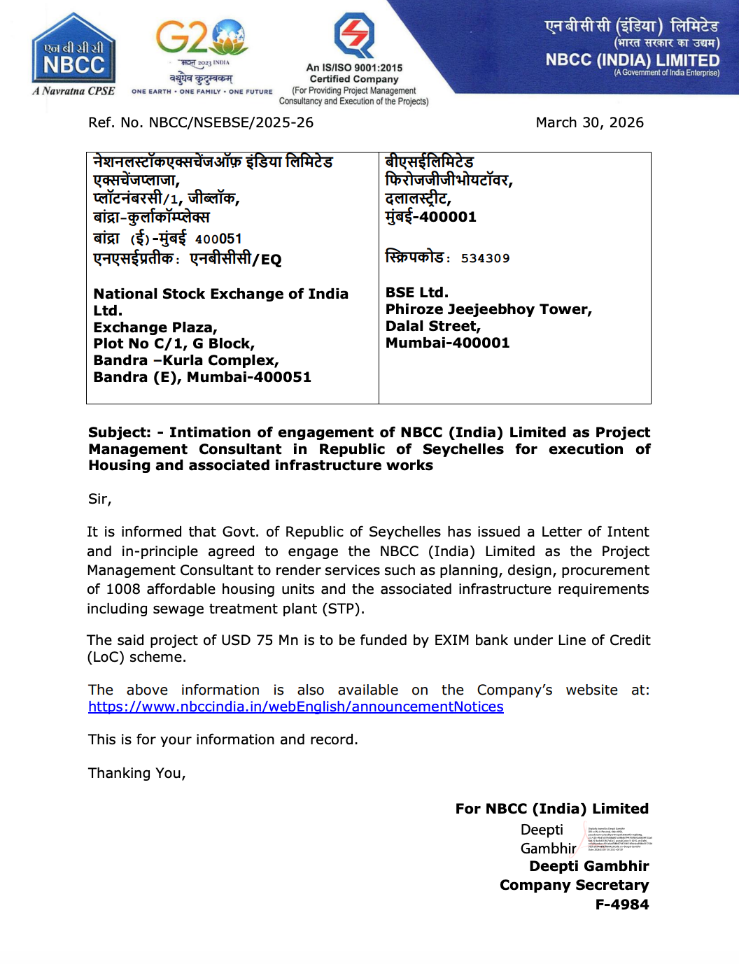 NBCC has received a Letter of Intent from the Government of Seychelles to act as a Project Management Consultant for executing housing and associated infrastructure projects.