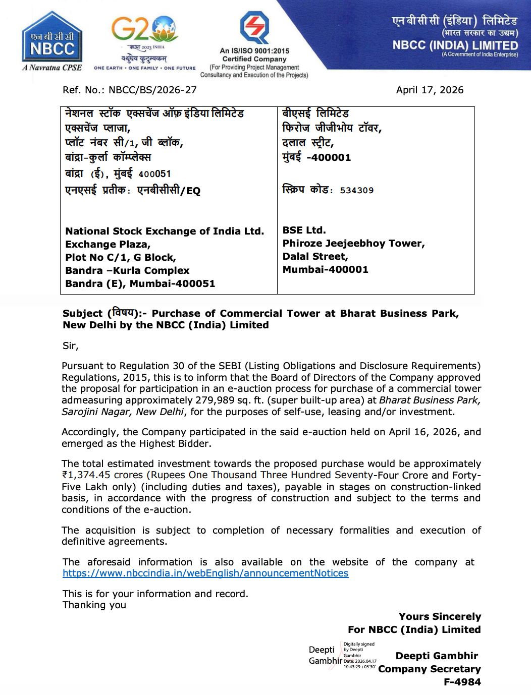 Official Exchange Filing: NBCC (India) Limited