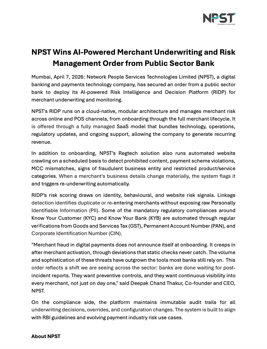 NPST has secured an order from a public sector bank to deploy its AI-powered Risk Intelligence and Decision Platform (RIDP), strengthening its position in the digital payments and RegTech space.