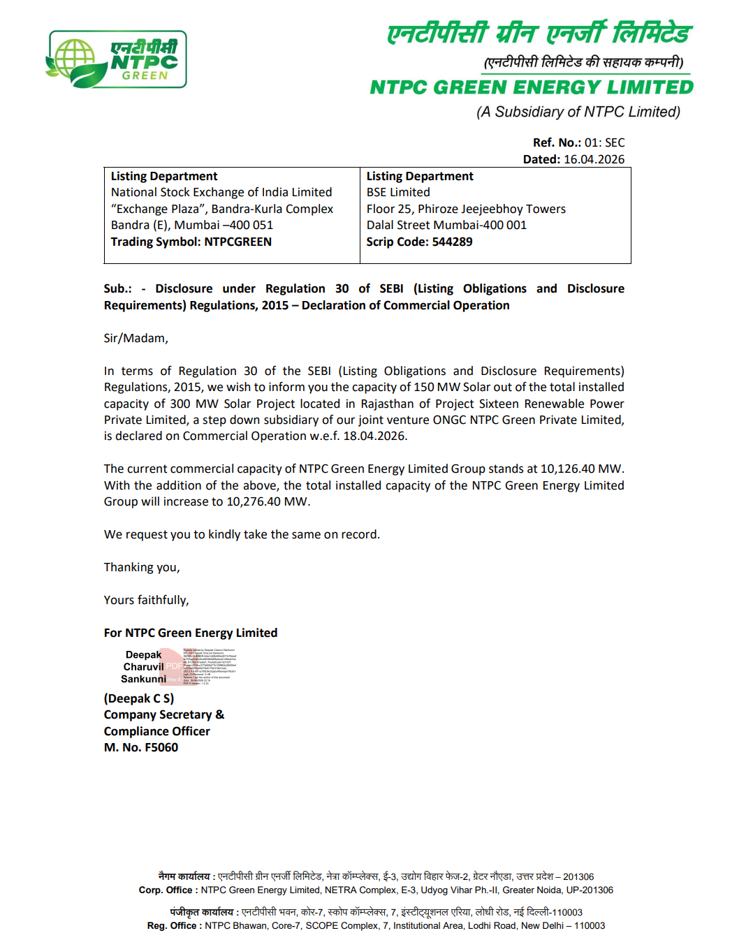 Official Exchange Filing: NTPC Green Energy Limited