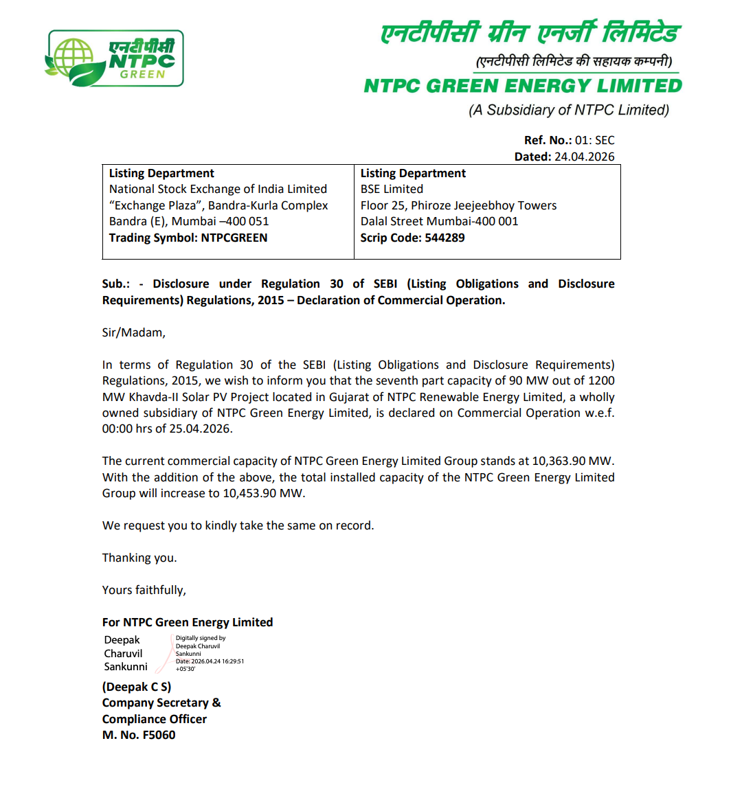 Official Exchange Filing: NTPC Green Energy Limited