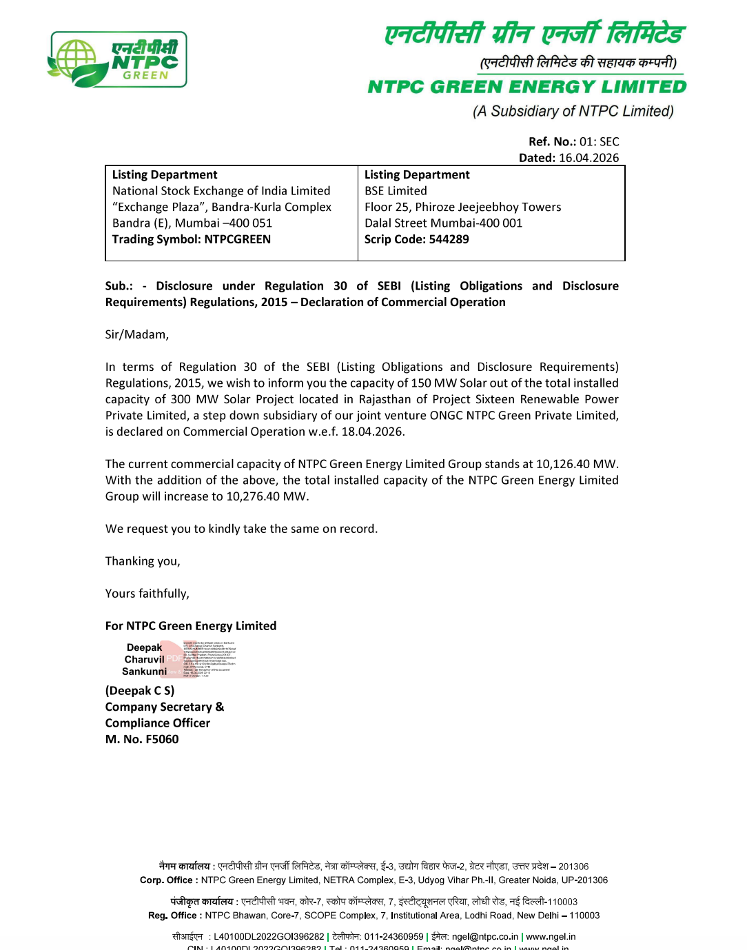 NTPC Limited announced that its subsidiary, NTPC Green Energy, has commissioned 150 MW solar capacity in Rajasthan, taking the total installed capacity of NTPC Group to 89,528 MW and commercial capacity to 88,448 MW.