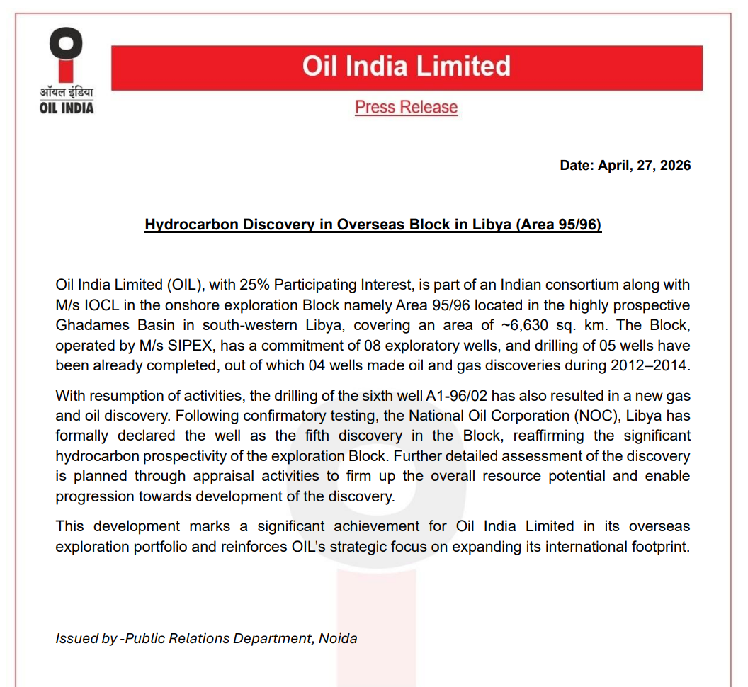 Oil India Limited has announced a new oil and gas discovery in its overseas Libya block (Area 95/96), marking the fifth discovery in the block and strengthening its international exploration portfolio.