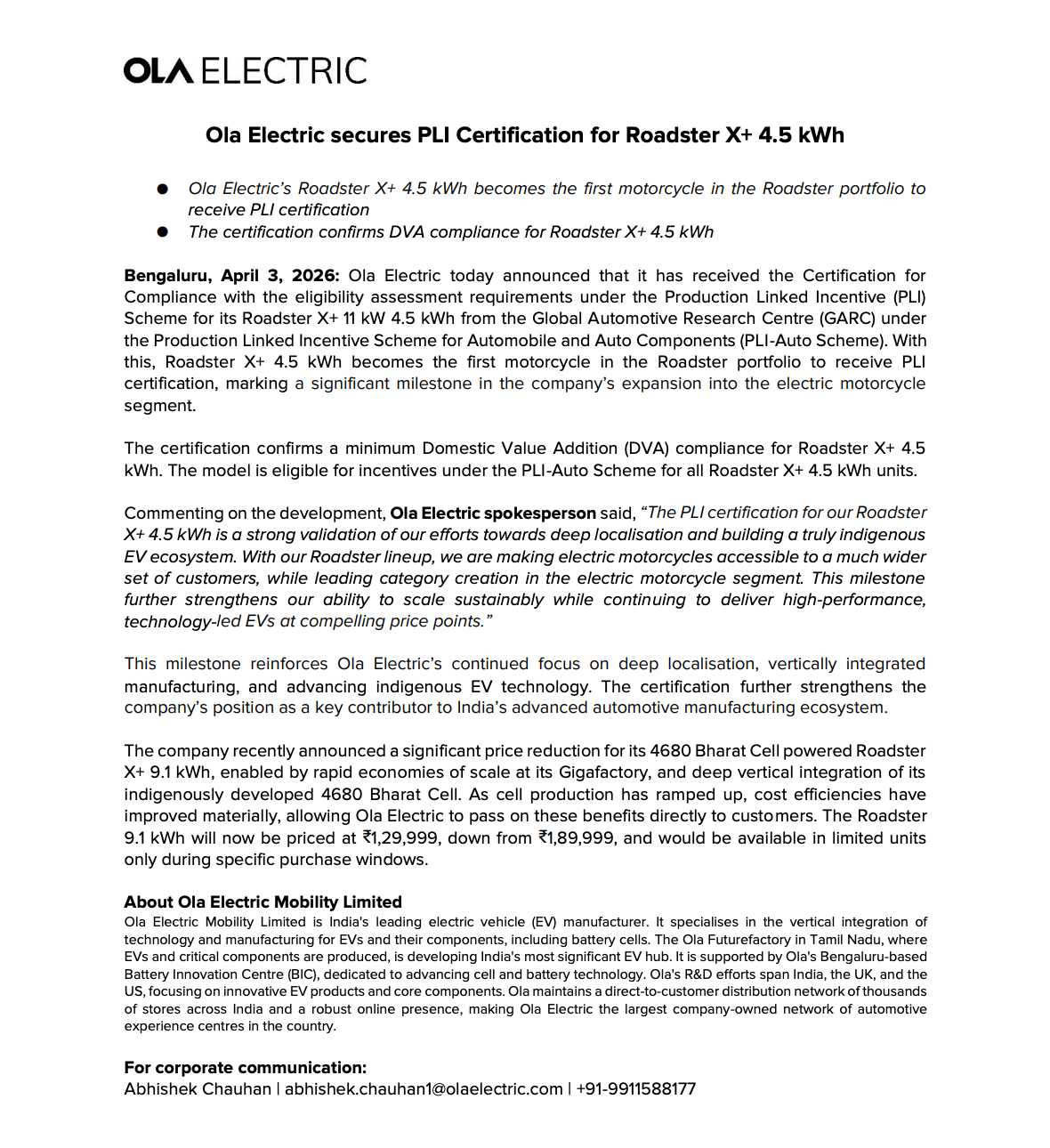 Ola Electric has received PLI certification for its Roadster X+ 4.5 kWh model, enabling eligibility for government incentives and strengthening its position in the electric motorcycle segment.