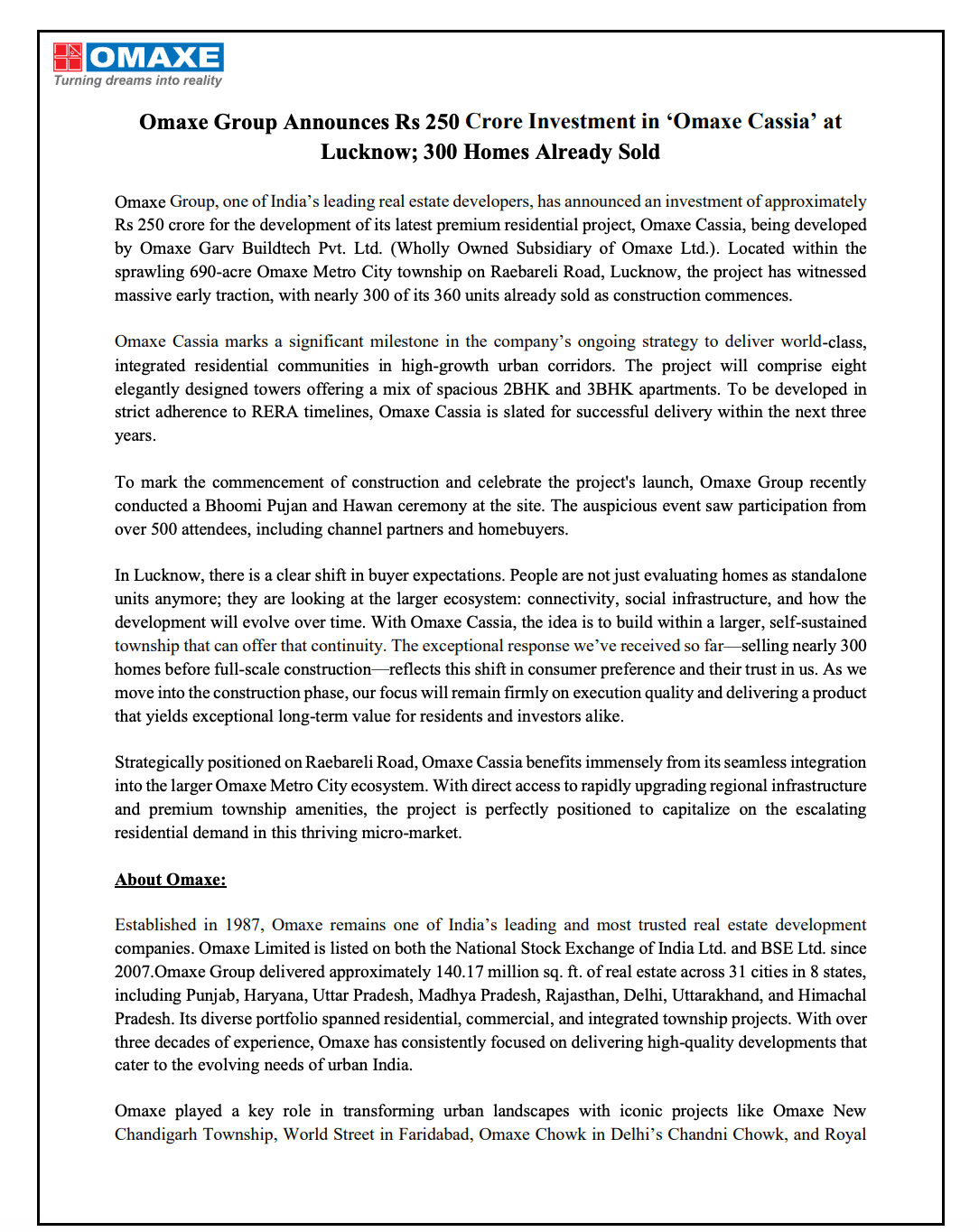 Omaxe Announces ₹250 Crore Investment in ‘Omaxe Cassia’ Lucknow; Strong Pre-Sales Momentum