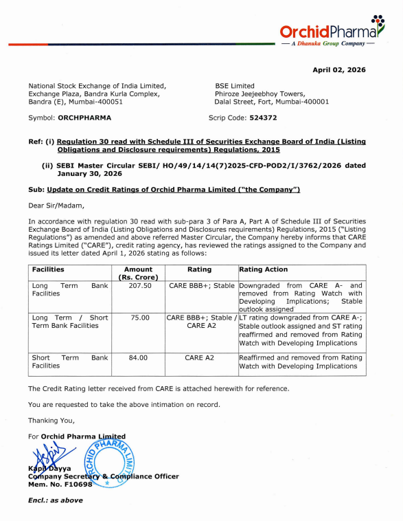 Orchid Pharma Limited informed that CARE Ratings has revised its credit ratings for the company’s bank facilities.