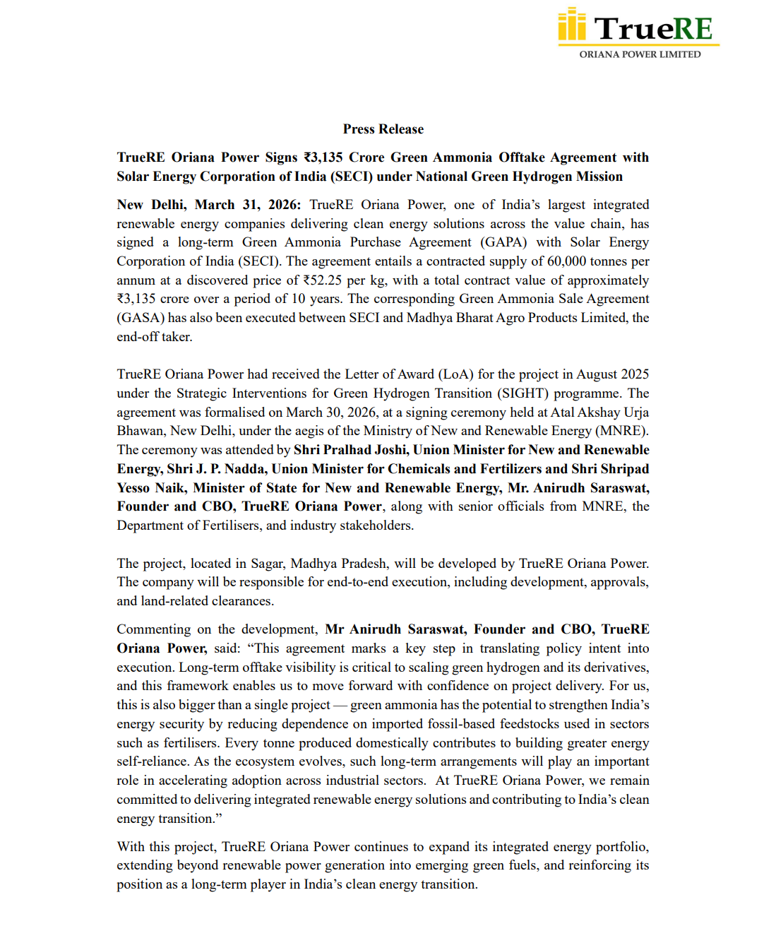 Oriana Power Limited (TrueRE) has signed a ₹3,135 crore long-term Green Ammonia Offtake Agreement with SECI, marking a major step in India’s green hydrogen ecosystem.