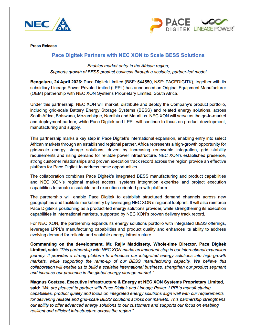 Pace Digitek Limited, along with its subsidiary Lineage Power Private Limited, has entered into an Original Equipment Manufacturer (OEM) partnership with NEC XON Systems Proprietary Limited, South Africa, to expand its Battery Energy Storage System (BESS) solutions into African markets.