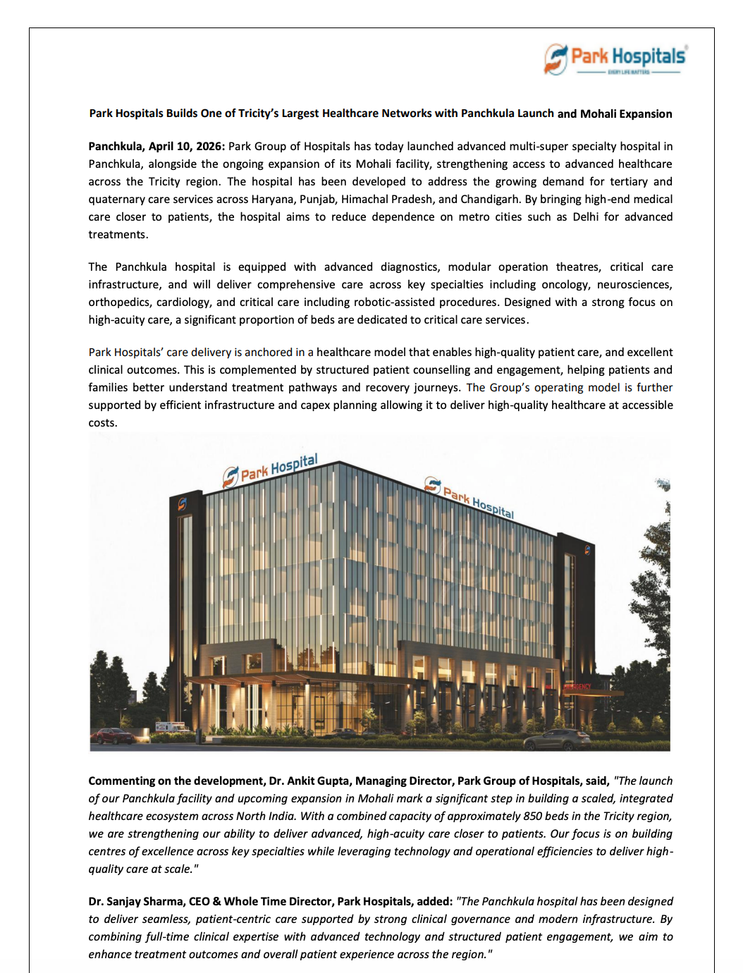 Park Medi World Limited informed exchanges that it has successfully launched its Panchkula hospital. This marks a key expansion step in strengthening its healthcare network across the Tricity region (Chandigarh, Panchkula, Mohali).