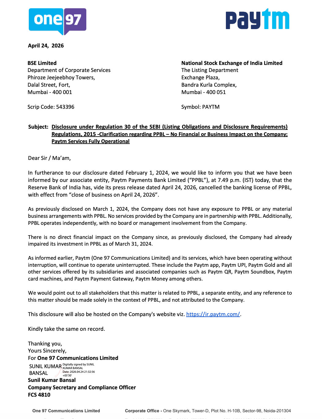 Official Exchange Filing: One97 Communications Limited (Paytm)