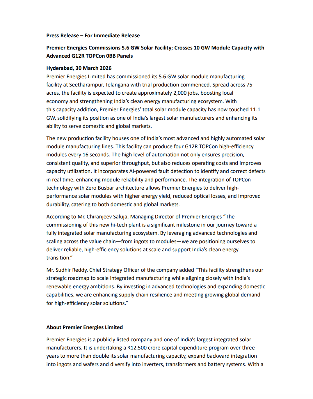 Premier Energies commissioned a 5.6 GW solar module manufacturing facility in Telangana, with trial production already underway.