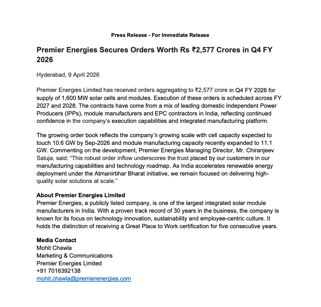 Premier Energies Limited announced that it has secured orders aggregating ₹2,577 crore during Q4 FY26.