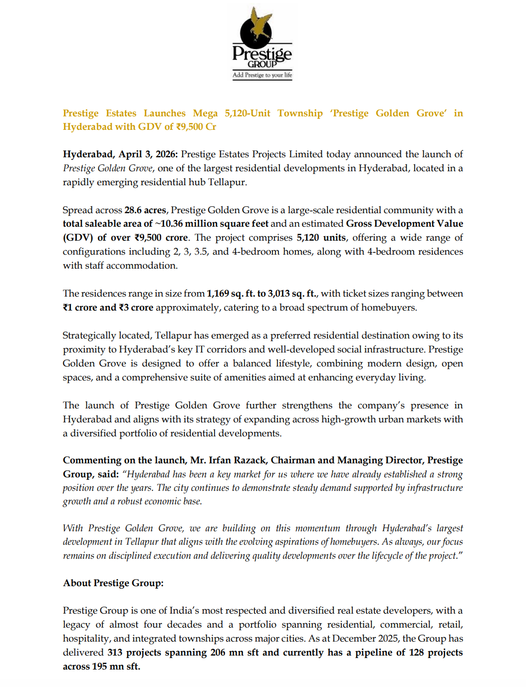 Prestige Estates has launched a large-scale residential township ‘Prestige Golden Grove’ in Hyderabad with a GDV of ₹9,500 crore, marking a significant expansion in a high-growth real estate market.
