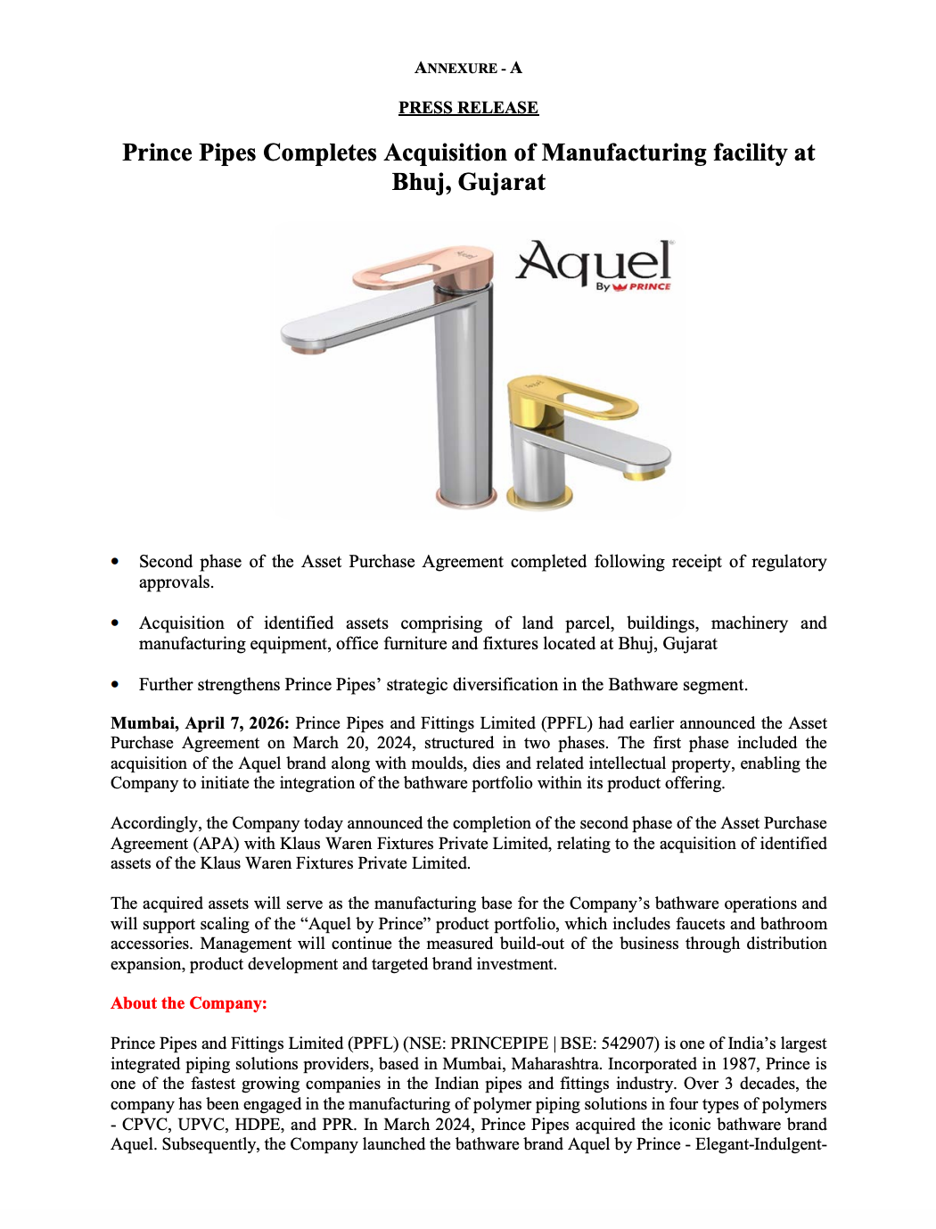 Prince Pipes and Fittings Limited has completed the second phase of its Asset Purchase Agreement (APA) with Klaus Waren Fixtures Private Limited for acquiring identified assets located at Bhuj, Gujarat.