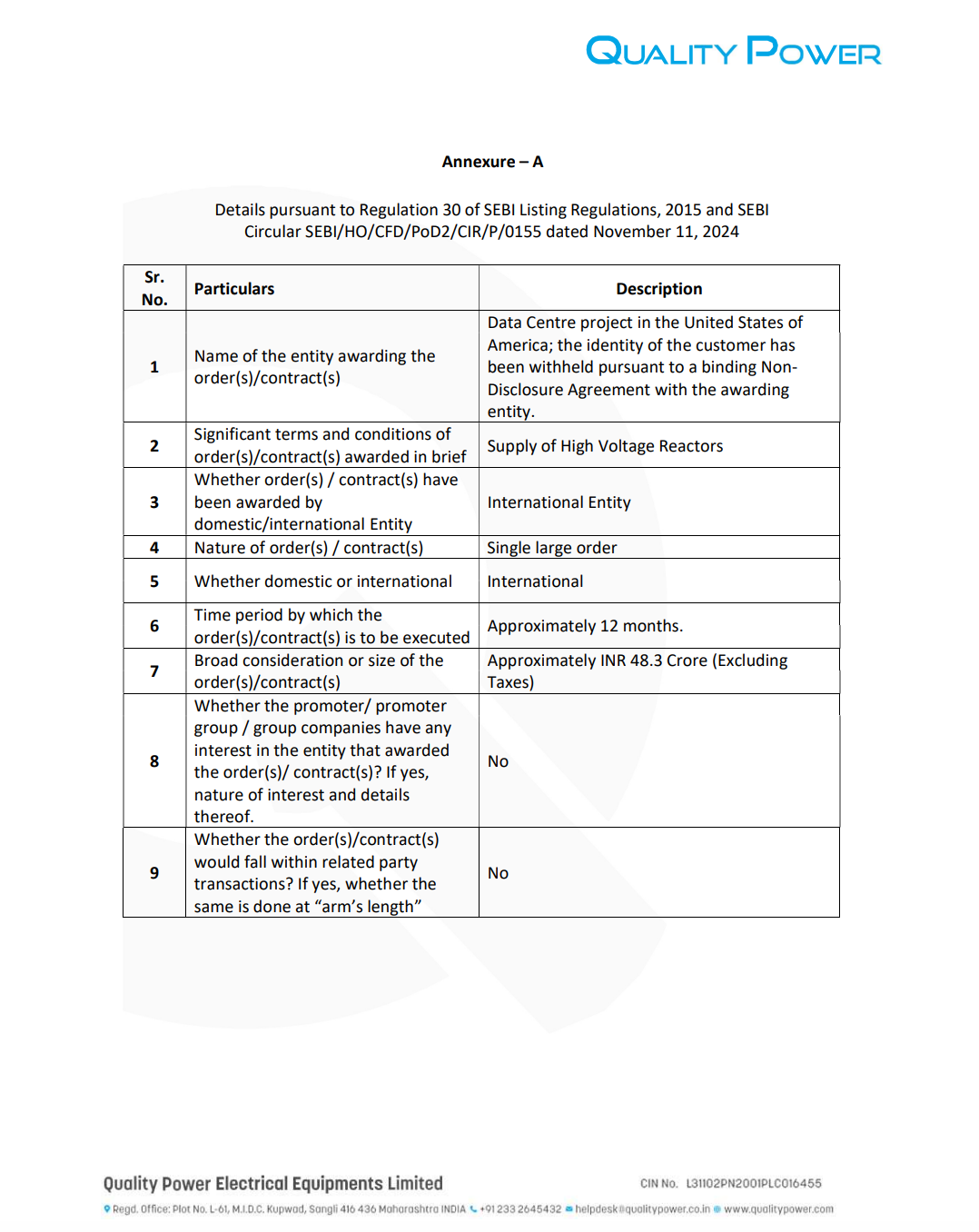 Official Exchange Filing: Quality Power Electrical Equipments Limited