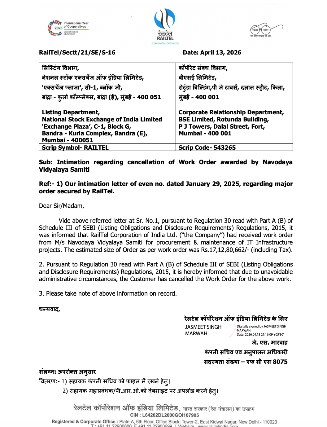 RailTel Corporation of India Limited has announced the cancellation of a previously awarded work order worth ₹17.12 crore by Navodaya Vidyalaya Samiti due to administrative reasons.