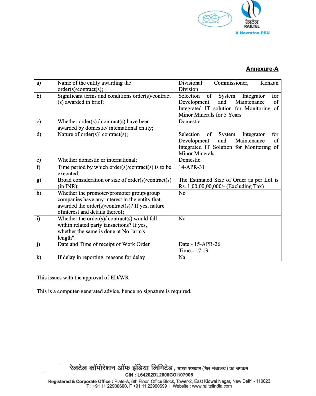 Official Exchange Filing: RailTel Corporation of India Limited
