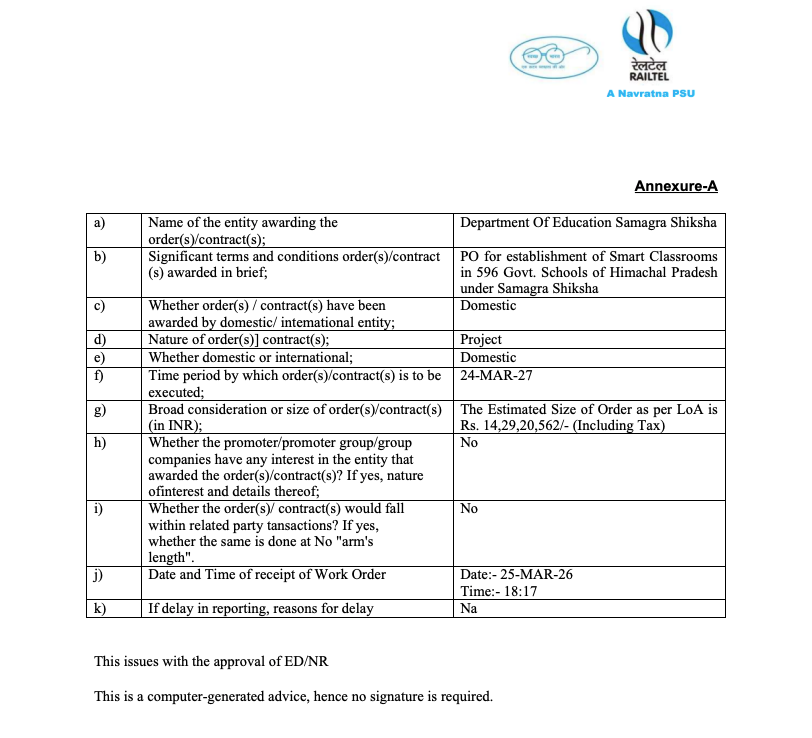 This aligns with RailTel’s digital infrastructure & government project focus.