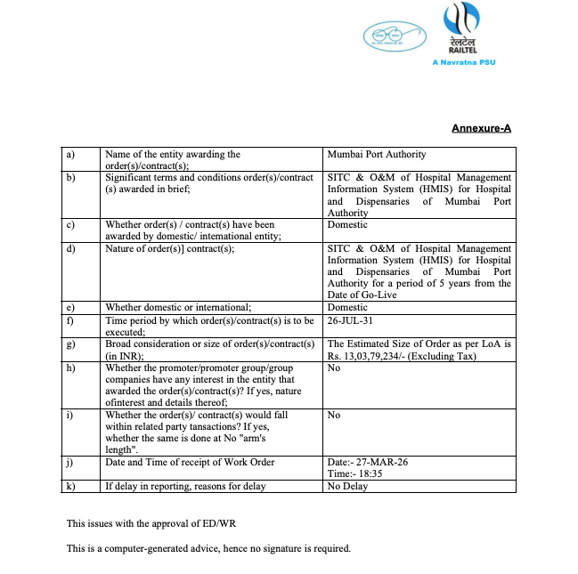RailTel has secured a ₹13.03 Cr order from Mumbai Port Authority for implementing and managing a Hospital Information Management System (HIMS).