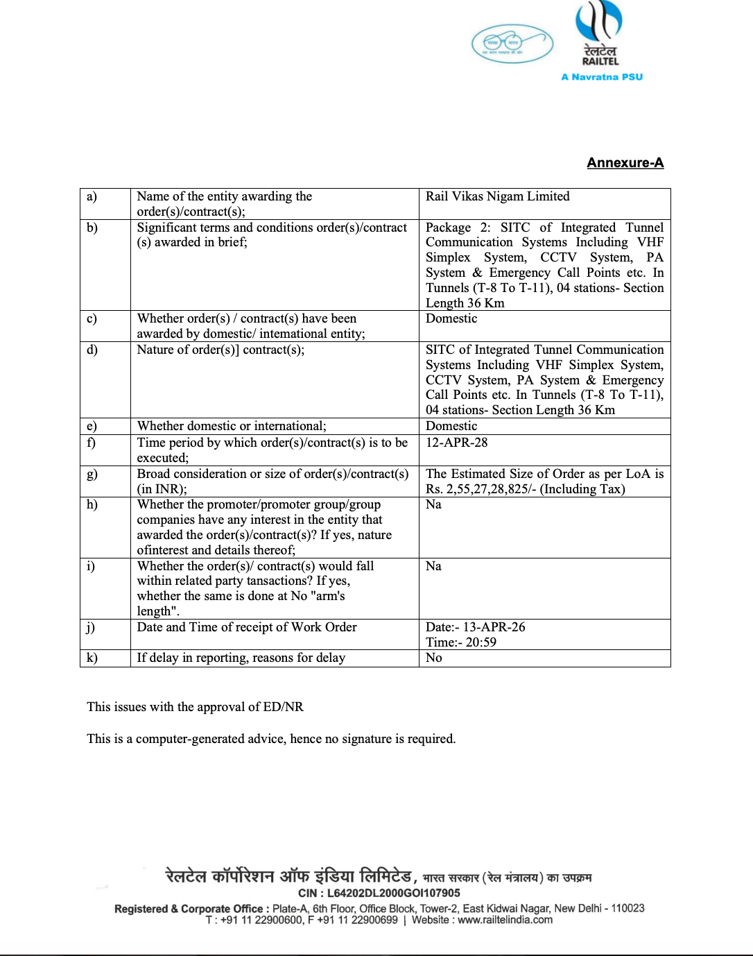 RailTel Corporation of India Limited has secured another major order worth ₹255.27 crore from Rail Vikas Nigam Limited (RVNL) for integrated tunnel communication systems, strengthening its railway infrastructure portfolio.