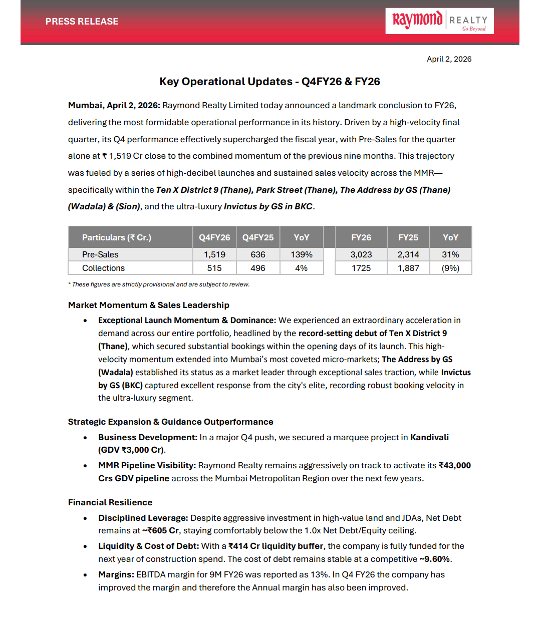 Raymond Realty Limited announced its Key Operational Updates for Q4FY26 & FY26, highlighting a strong finish to the fiscal year.