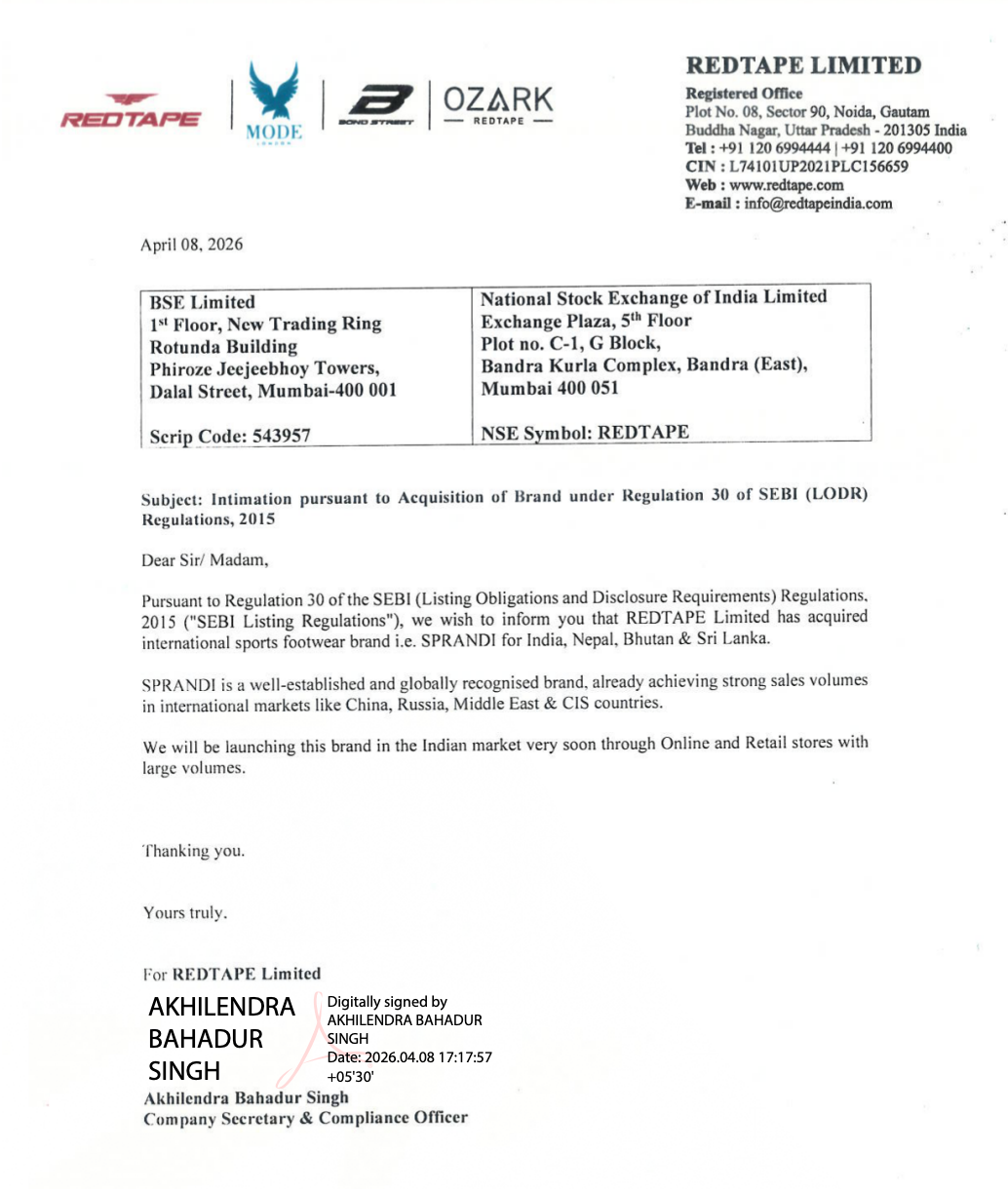 RedTape Limited has acquired the international sports footwear brand SPRANDI for India, Nepal, Bhutan, and Sri Lanka, strengthening its brand portfolio and expanding its presence in the sports footwear segment.