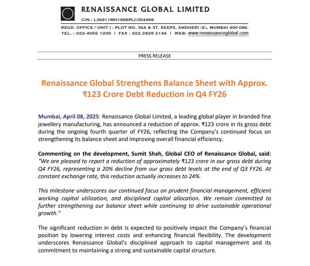 Renaissance Global Limited announced a reduction of approximately ₹123 crore in its gross debt during Q4 FY26, reflecting improved financial discipline and working capital management.