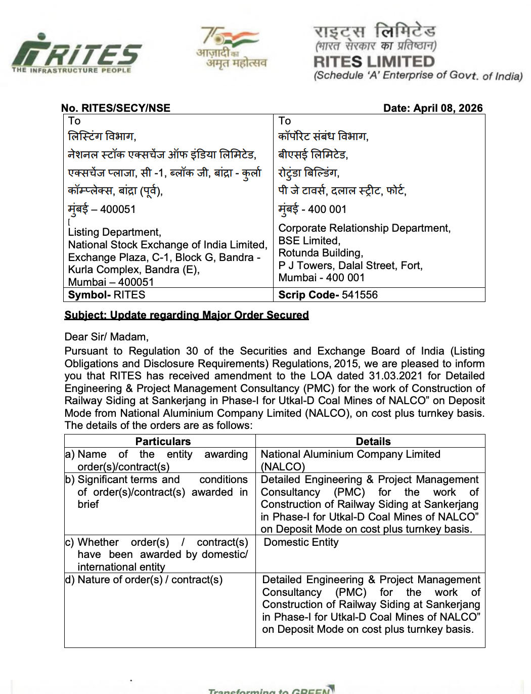 RITES Limited announced that it has received an amendment to an existing contract awarded by NALCO (National Aluminium Company Limited).