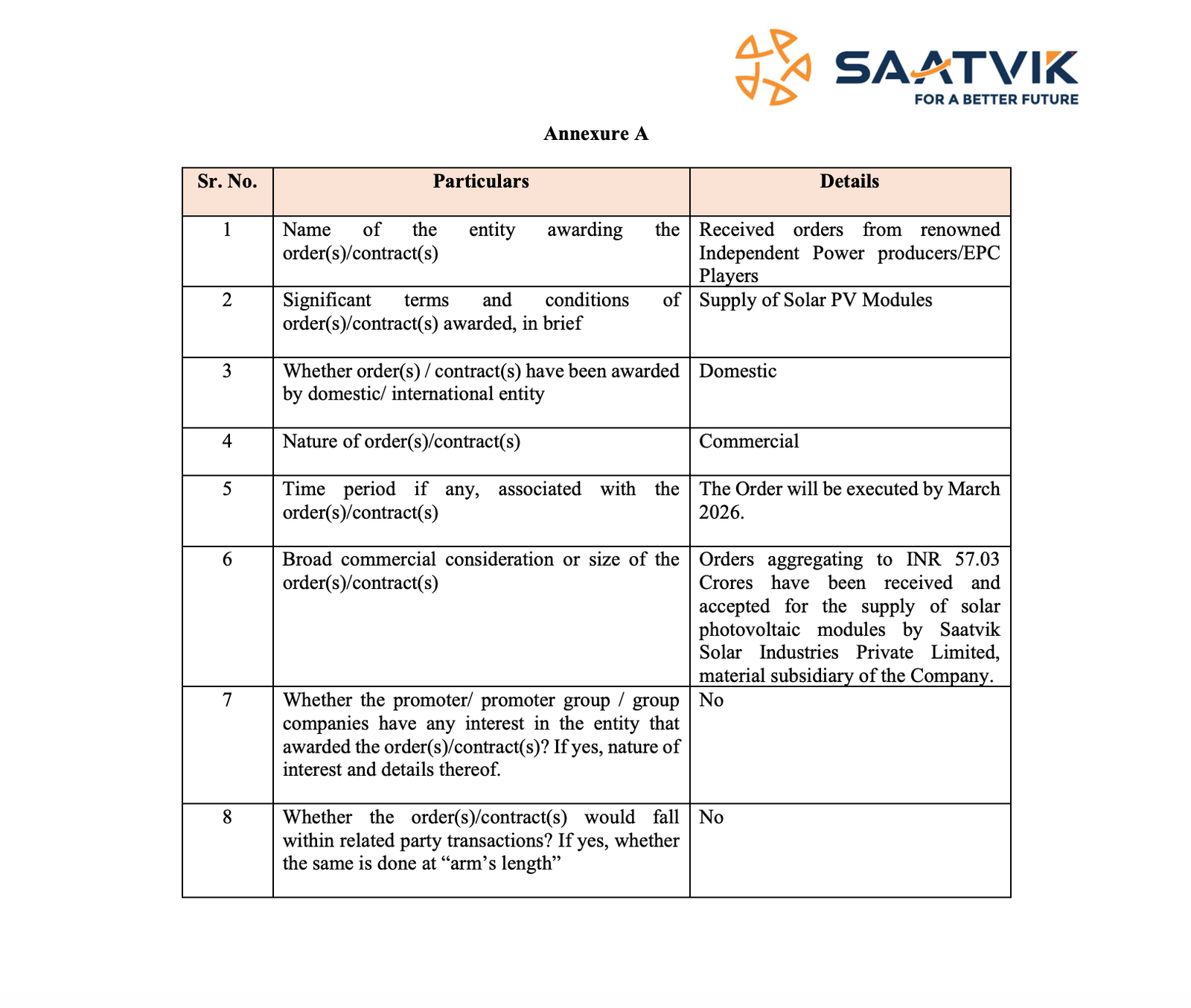 Saatvik Green Energy Limited has received and accepted orders worth ₹57.03 crore for the supply of solar PV modulesthrough its material subsidiary. The orders are from reputed independent power producers and EPC players.