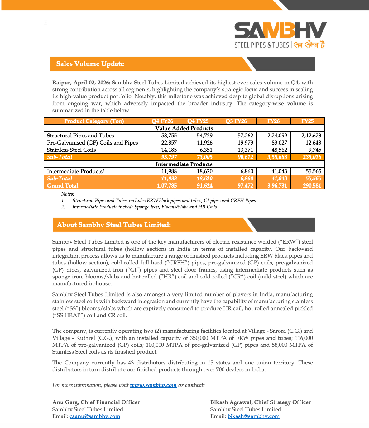 Sambhv Steel Tubes Limited announced its sales volume update for Q4FY26, reporting its highest-ever quarterly sales performance.