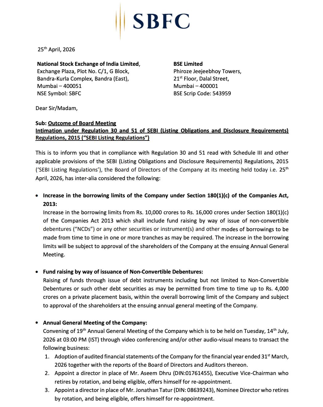SBFC Finance Limited’s Board approved an increase in its borrowing limits and sanctioned raising funds through issuance of Non-Convertible Debentures (NCDs), subject to shareholder approval