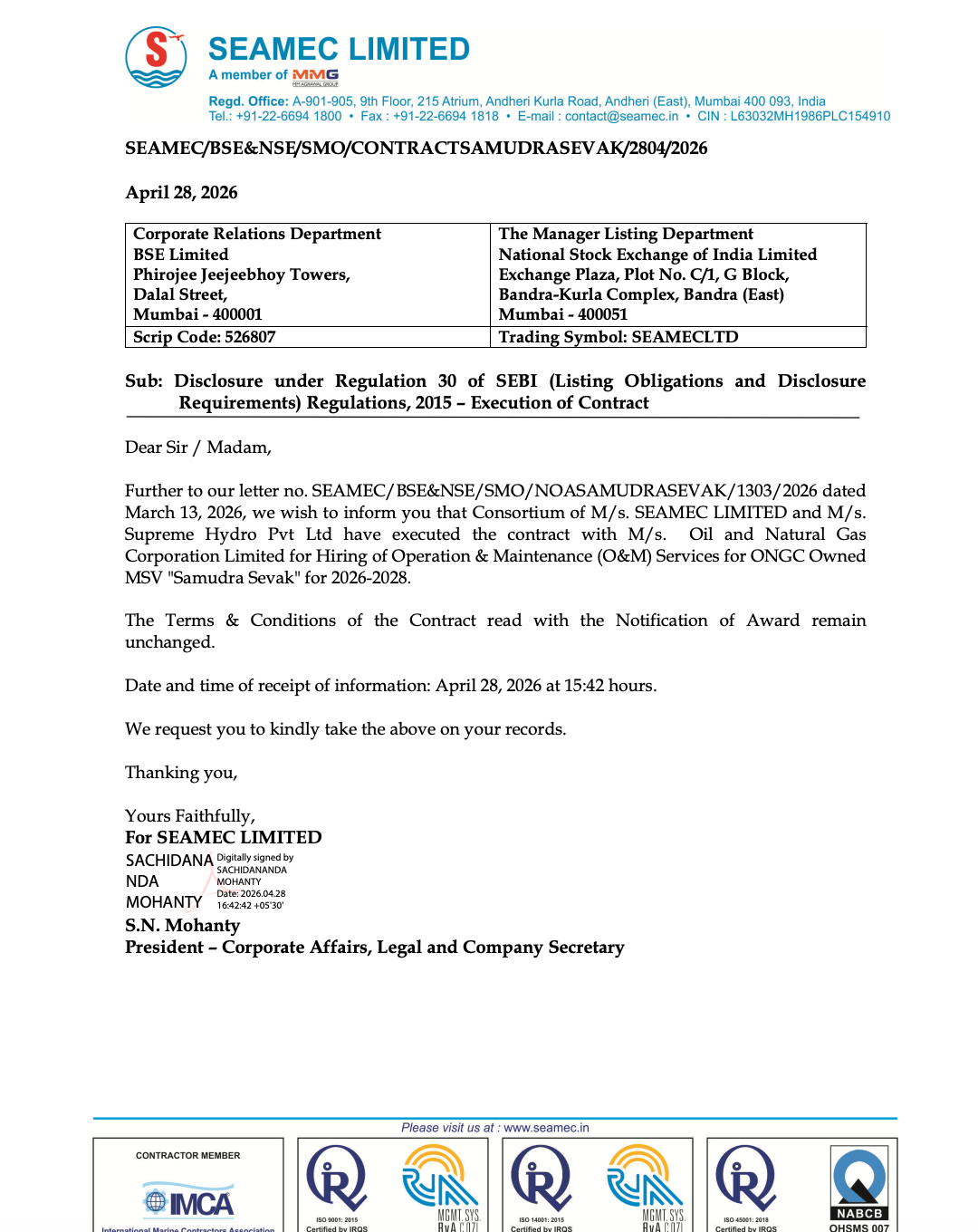 SEAMEC Limited, in consortium with Supreme Hydro Pvt Ltd, has executed a contract with ONGC for Operation & Maintenance (O&M) services of MSV “Samudra Sevak” for 2026–2028.