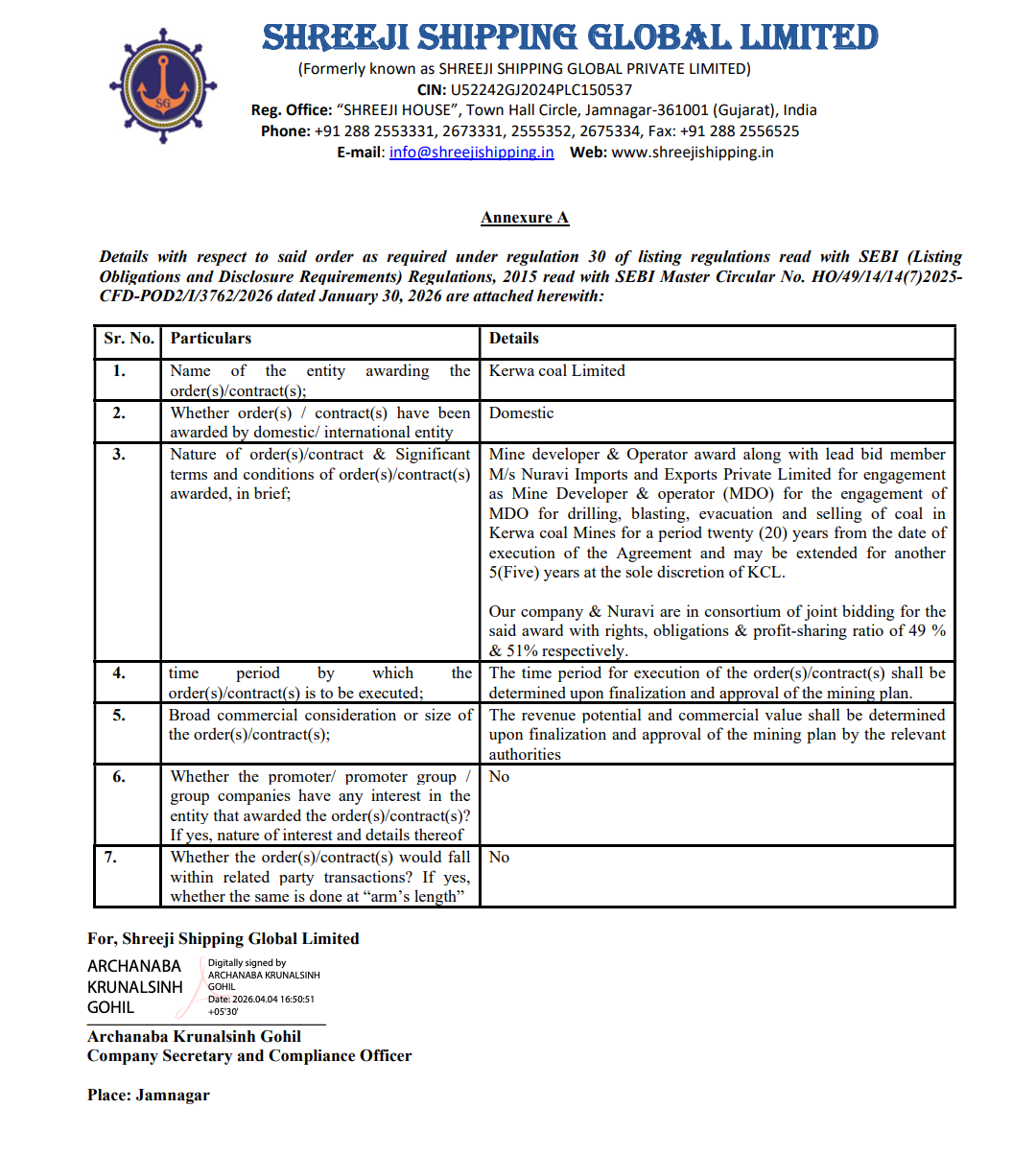 Official Exchange Filing: Shreeji Shipping Global Limited